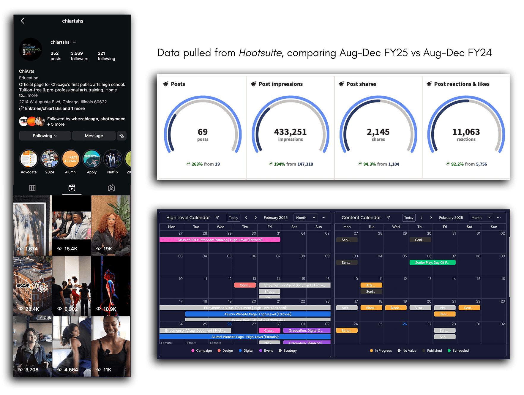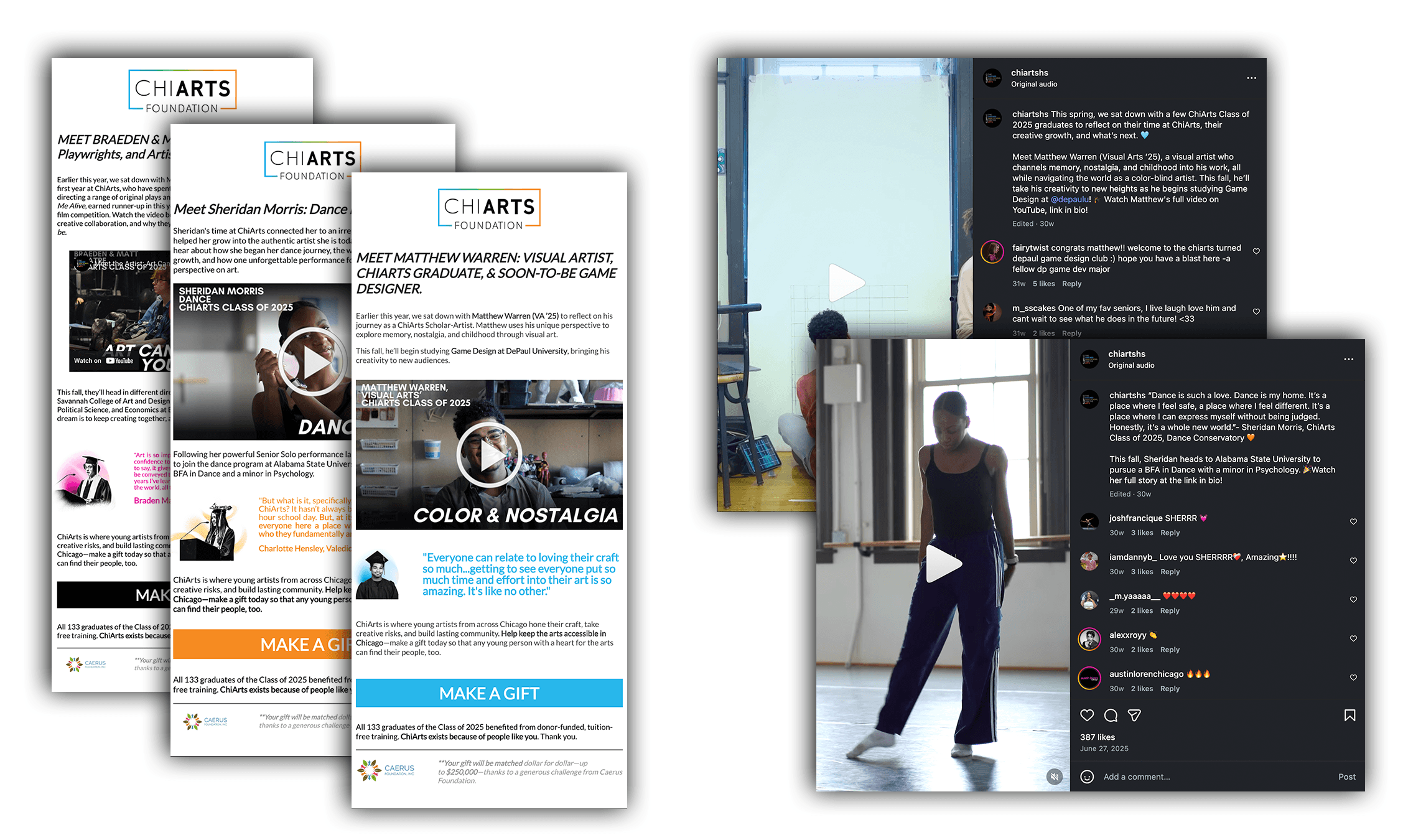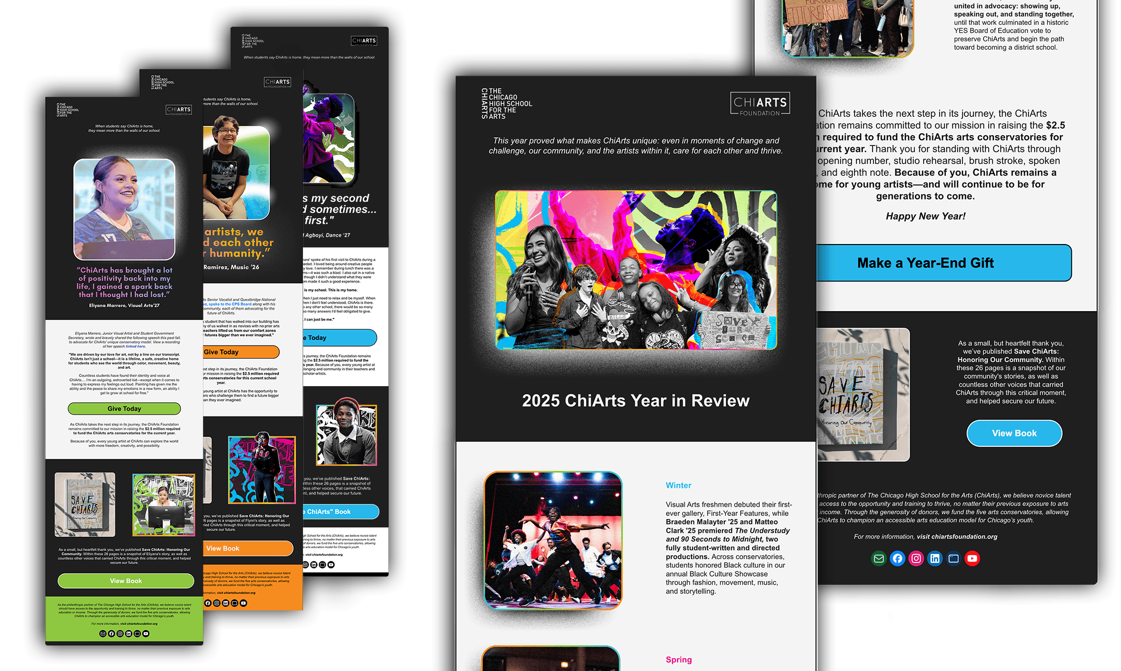 Reporting to the Director of Marketing & Communications, I focused on content creation and strategy, developing and maintaining ChiArts’ digital channels and supporting various marketing initiatives. Owning the content process from brainstorming to publishing, I collaborated with the Development, Admissions, and Alumni Programs teams, tailoring content to their respective communication needs, including fundraising, recruitment, and community engagement goals. From email-first appeal campaigns and regular social media content to our annual benefit video and end-of-year print mailings, my time at The ChiArts Foundation strengthened my adaptability and broadened my understanding of effective communication.