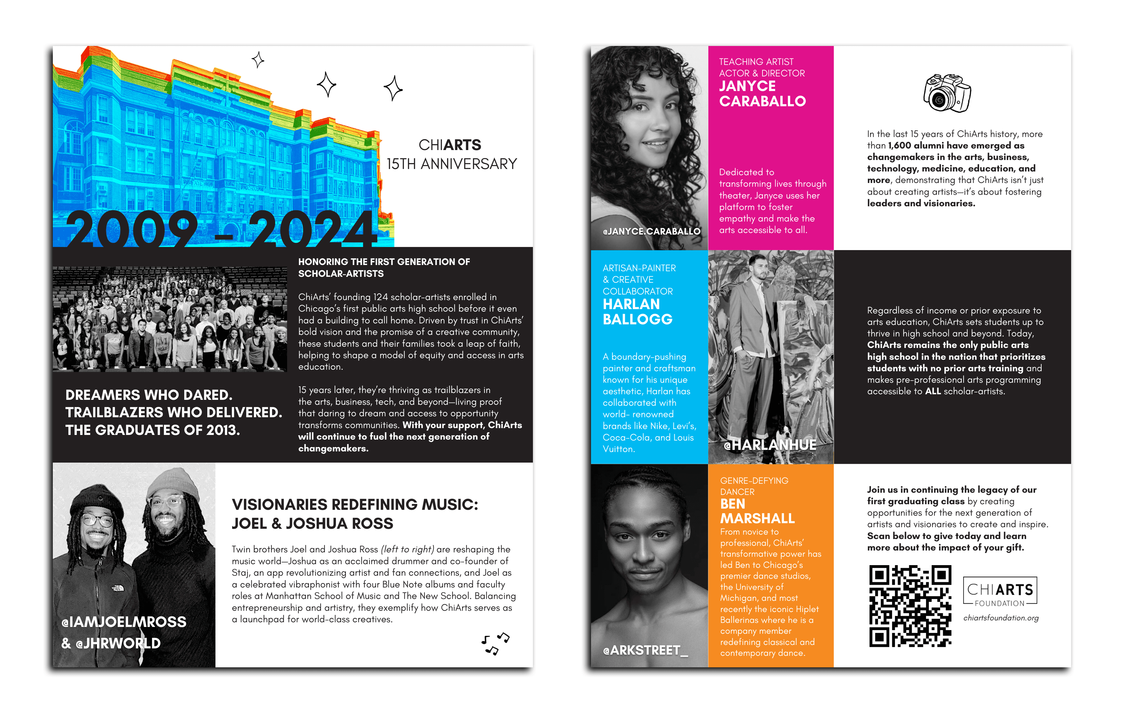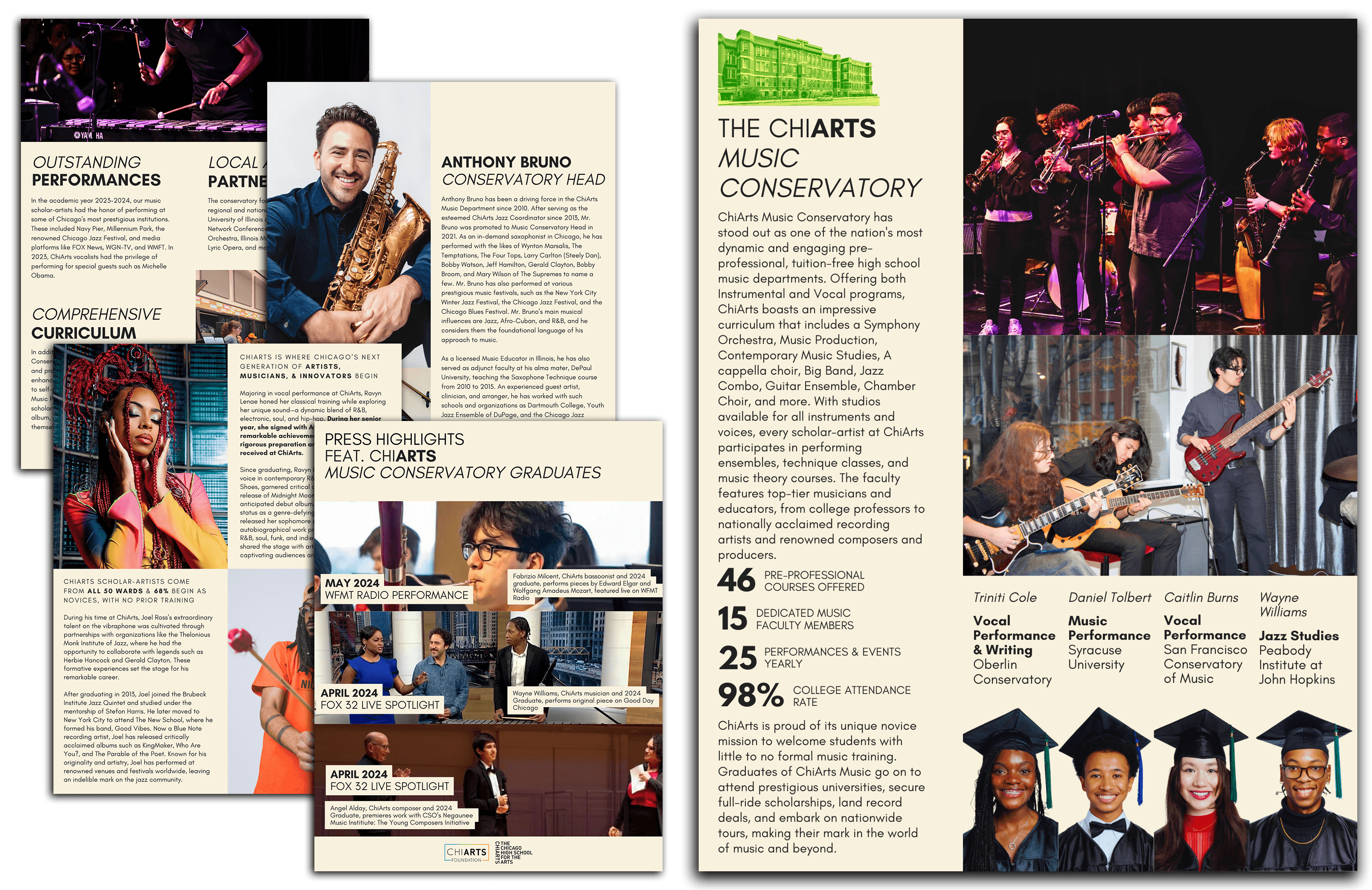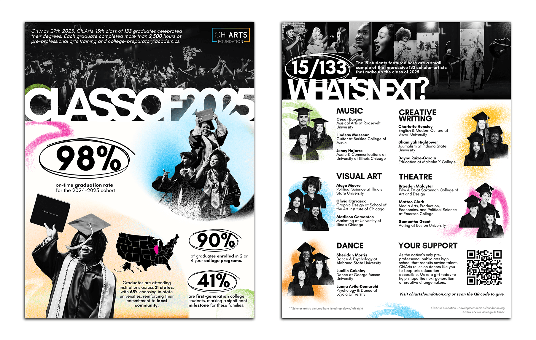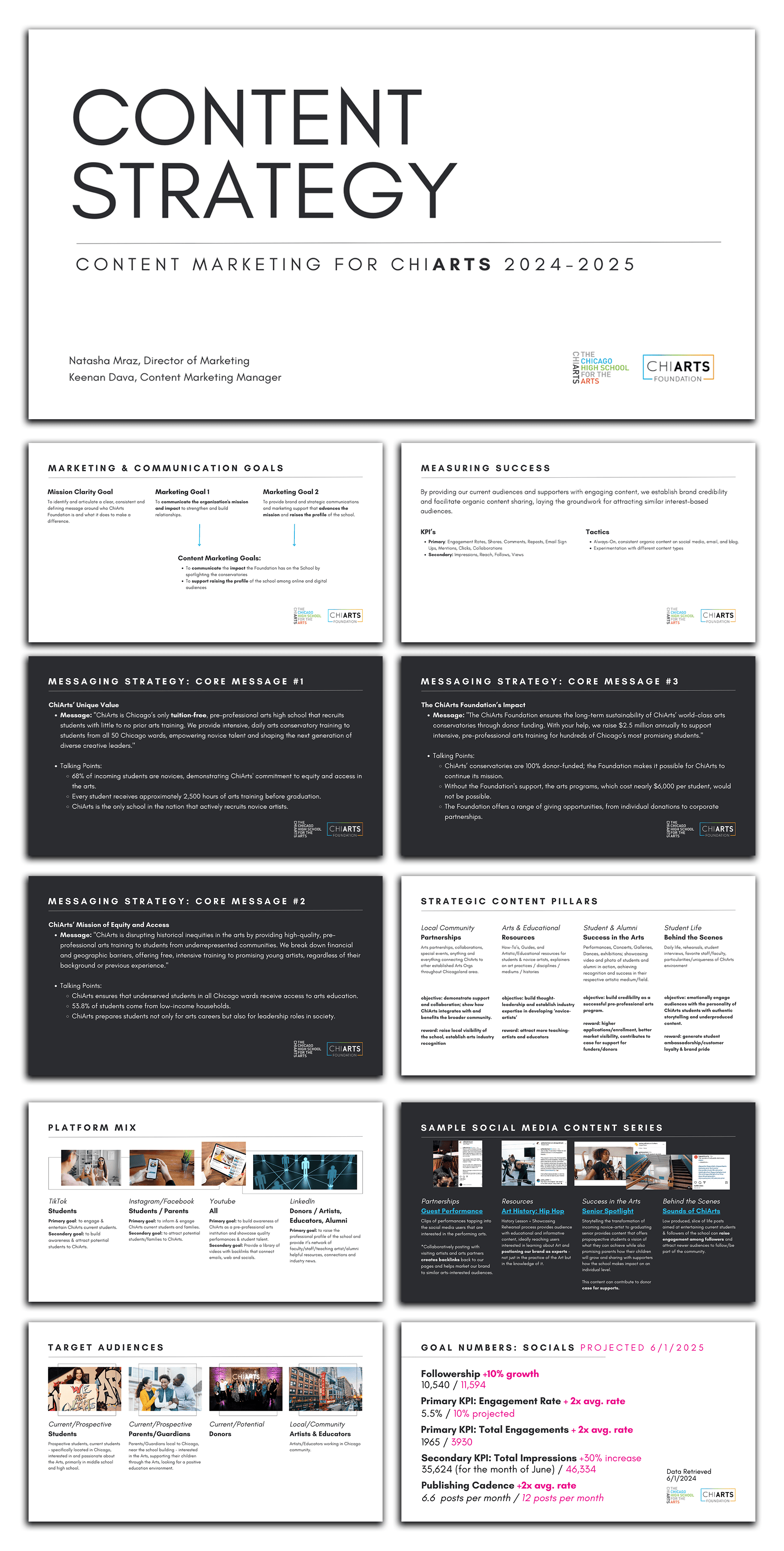 Reporting to the Director of Marketing & Communications, I focused on content creation and strategy, developing and maintaining ChiArts’ digital channels and supporting various marketing initiatives. Owning the content process from brainstorming to publishing, I collaborated with the Development, Admissions, and Alumni Programs teams, tailoring content to their respective communication needs, including fundraising, recruitment, and community engagement goals. From email-first appeal campaigns and regular social media content to our annual benefit video and end-of-year print mailings, my time at The ChiArts Foundation strengthened my adaptability and broadened my understanding of effective communication.